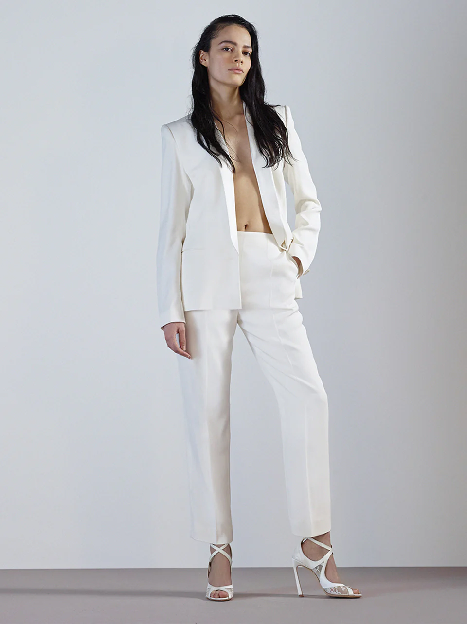 Tailored tuxedo jacket in ivory crepe, lined in silk satin. The jacket features contrast silk satin lapels and jetted pockets. Embellished with hand-covered silk tulle crystal buttons.