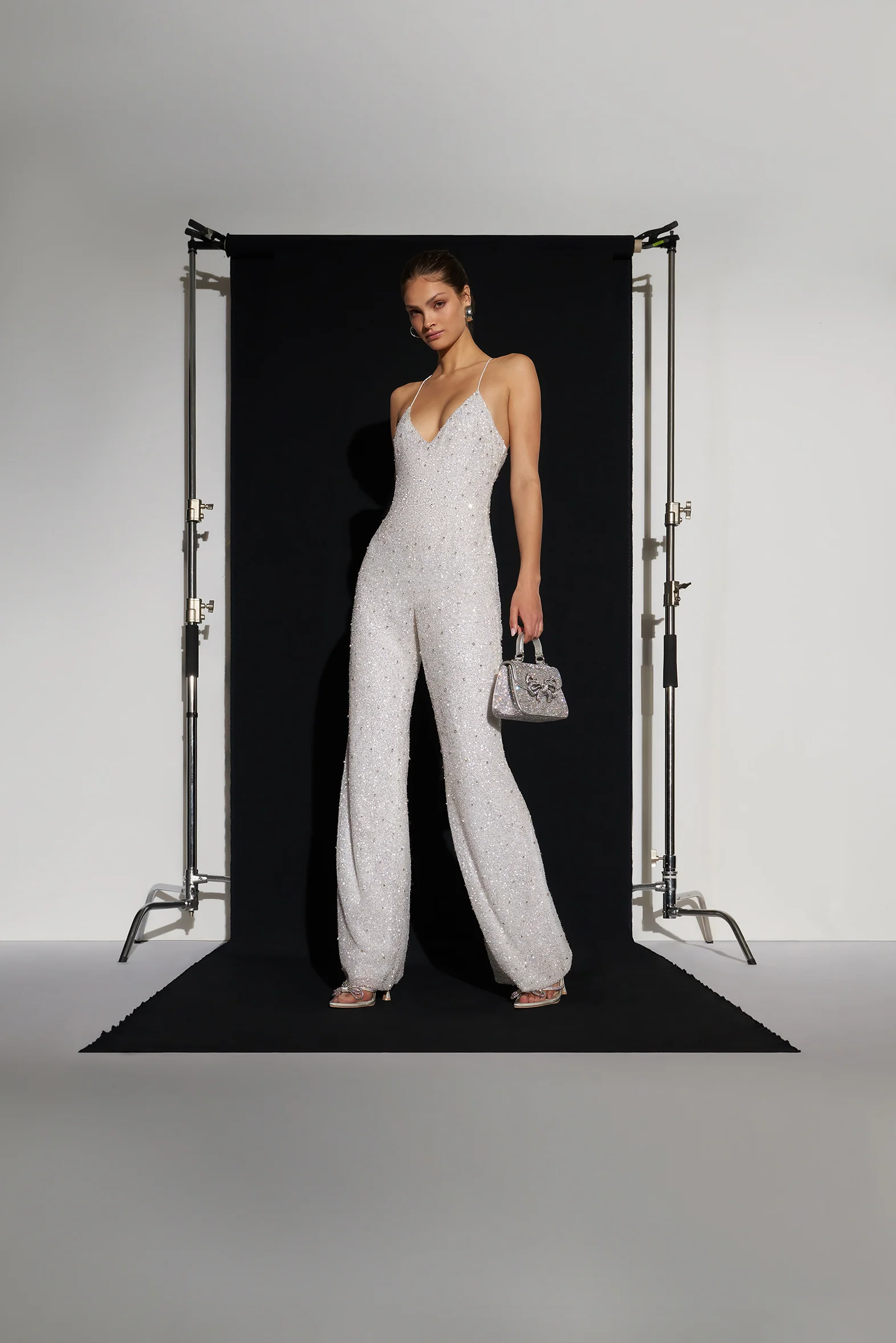 A hand-beaded jumpsuit that features a low plunge front and daring open shoulder back. Fully satin-lined, it cinches at the waist and boasts a slight flared leg for an effortlessly chic silhouette.