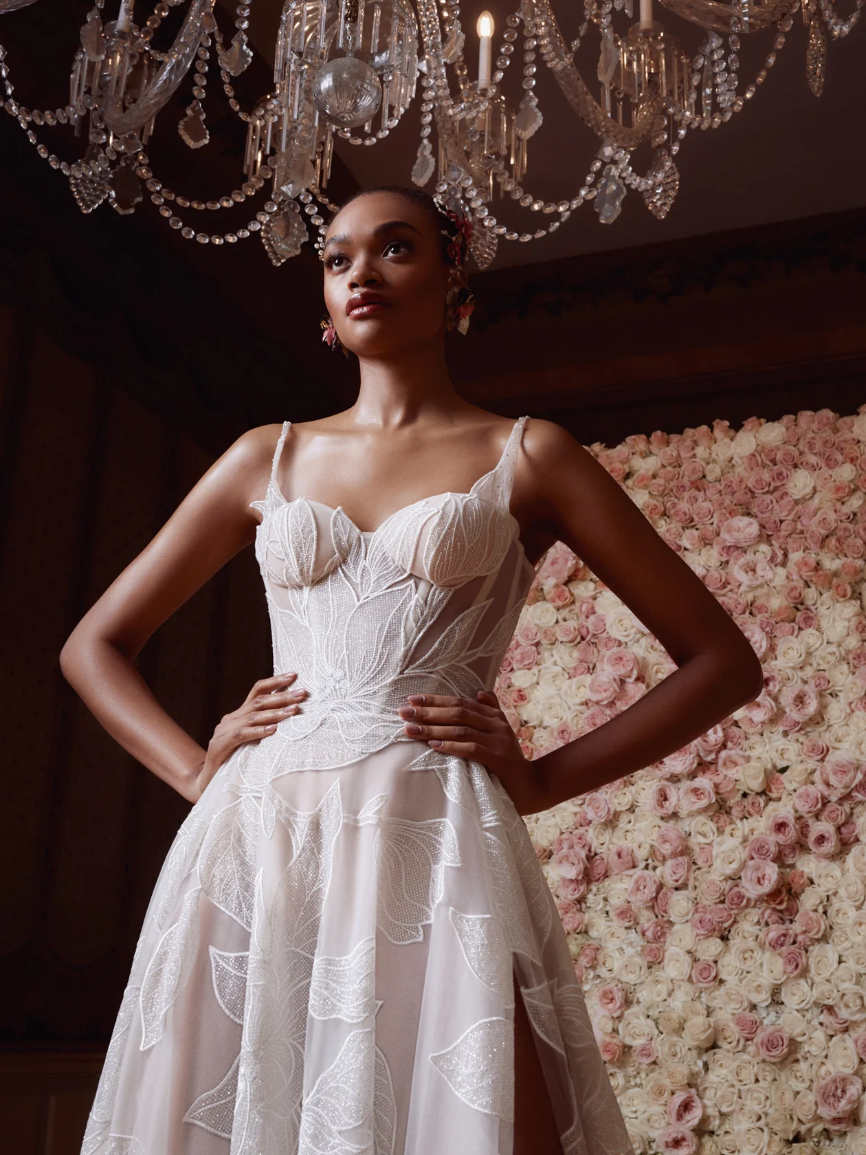 Inspired by the gracefulness of petals in slow motion, “Bonny” is a tulle extravaganza A-line gown, blossoming from corset top to high-slit skirt through to long train. Embroidered with sparkled appliqués for a splash of ethereal beauty.
