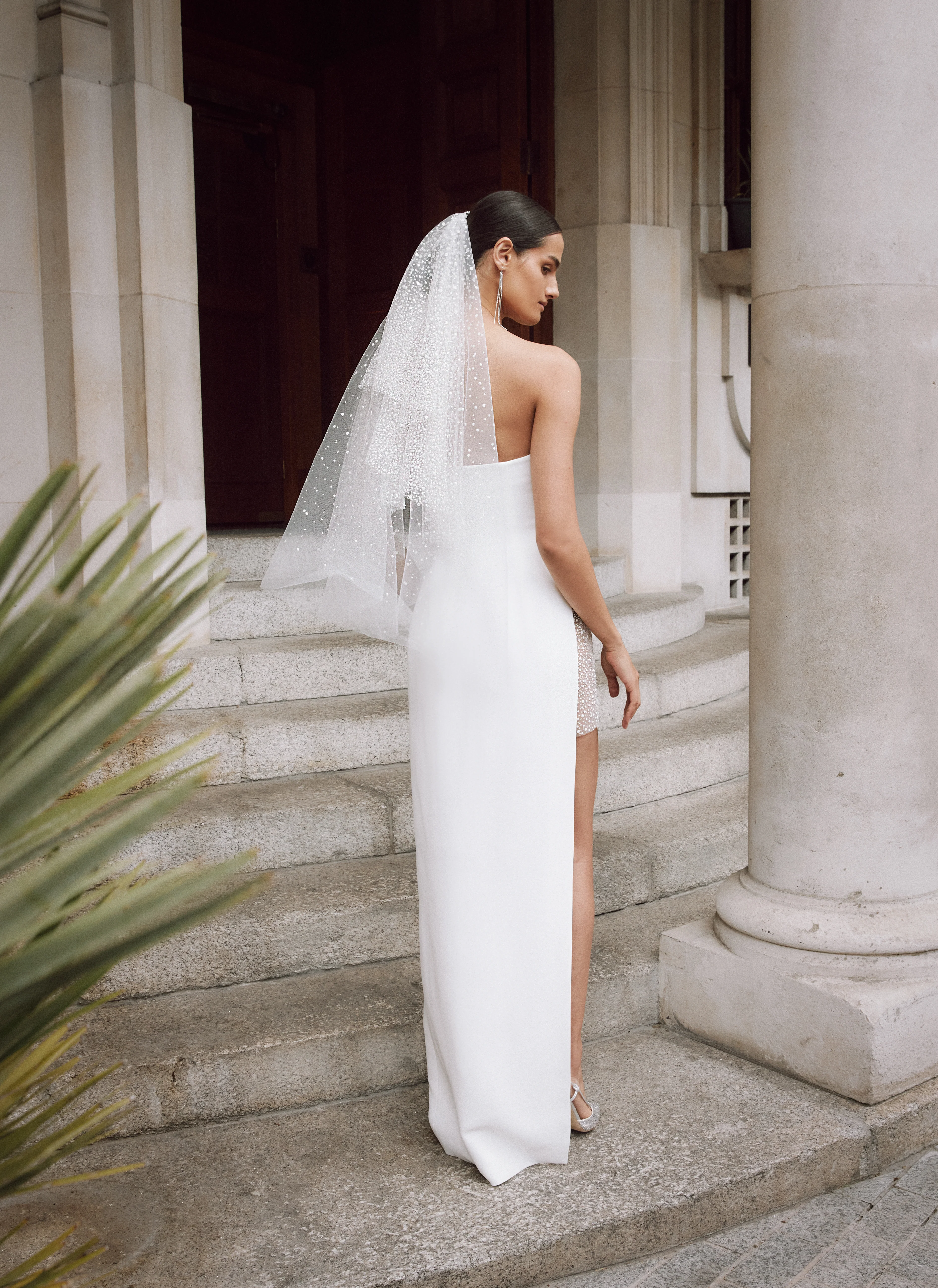 The glamorous “Carmen” is a strapless crepe column dress with a contemporary twist. Designed for a close body fit, she delivers modern style and fashion-forward elegance, featuring a daring thigh-high side slit that showcases an embellished beaded net bodice.