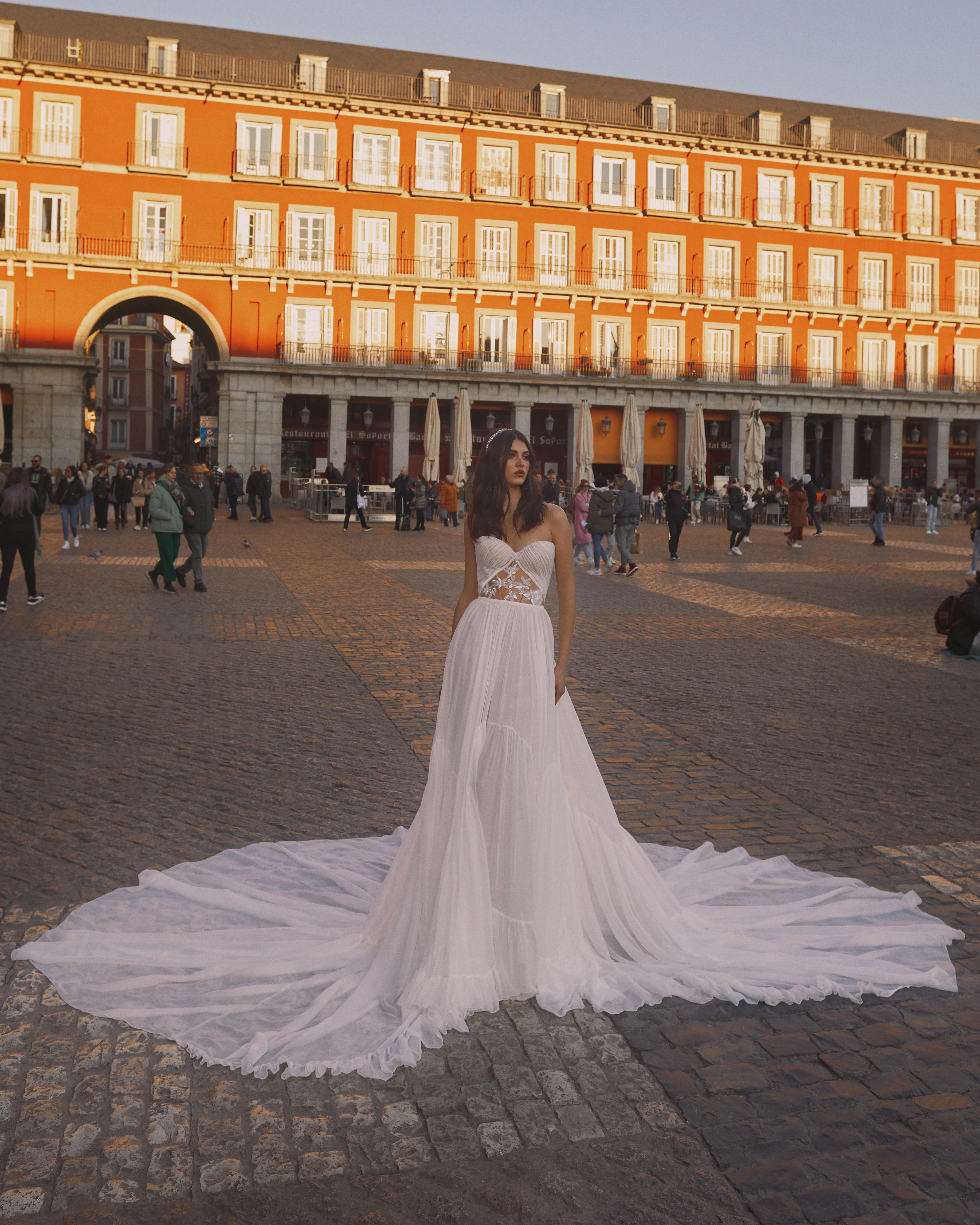 Step into a lightweight and flowing Galia Lahav design with "Danny" from the GALA collection Encanto. This silk chiffon A-line gown creates an urban boho chic look with her unique lace appliqué corset, irregularly hemmed skirt, and gloriously long train. Celebrate your love story in the most enchanting way possible.