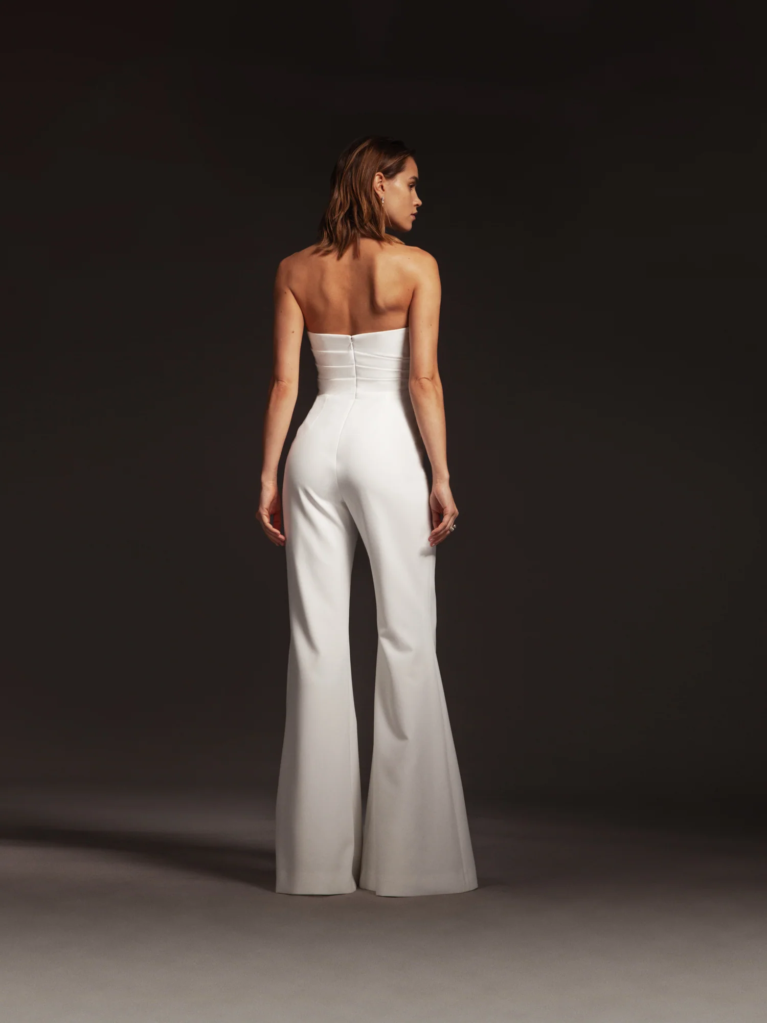 "Heather" is a stylish, strapless, fully boned corseted piece of elegant structure, complemented by a long, flared trouser that creates a modern silhouette. Made in luxurious crepe, Heather is perfect for any event.