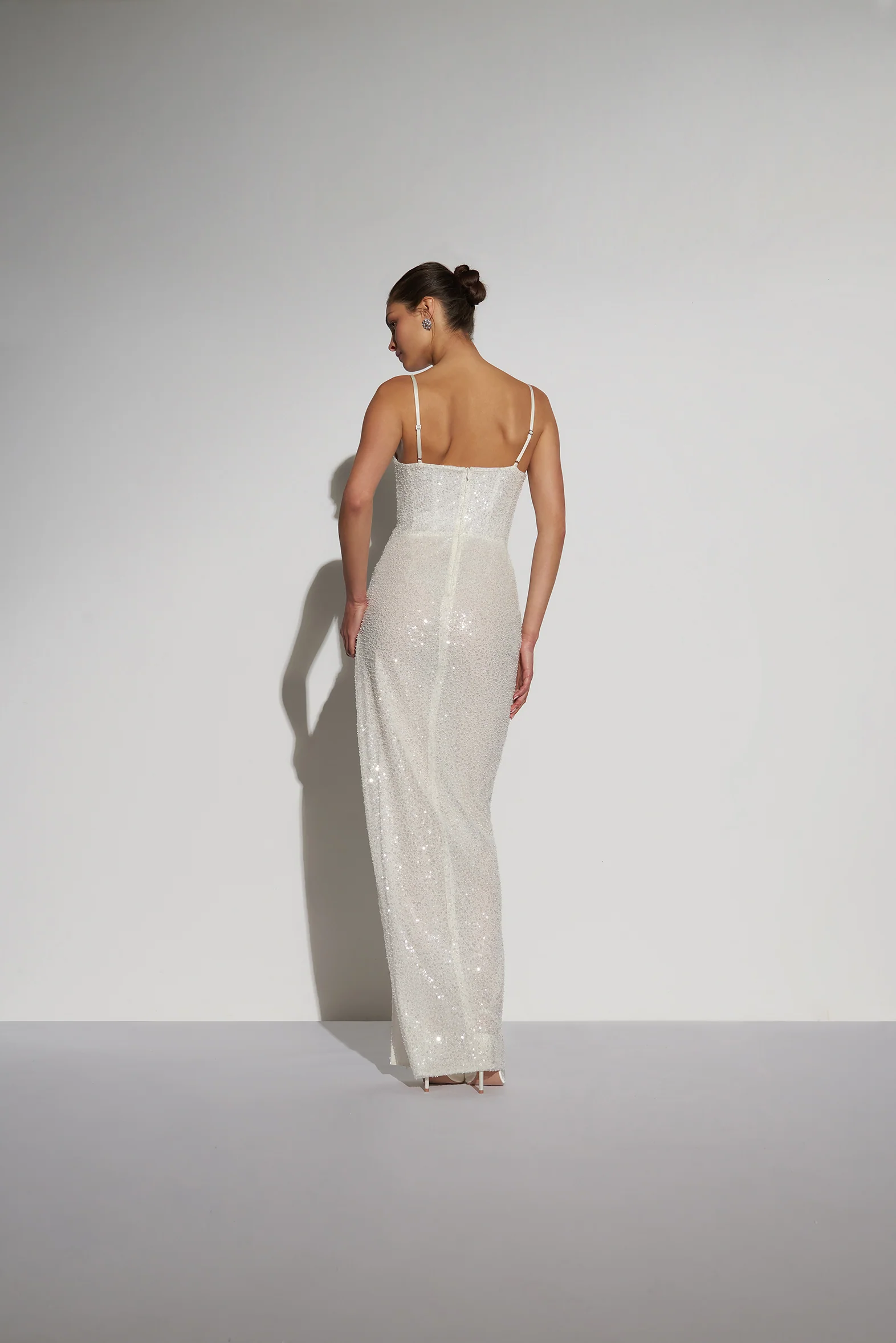 Crafted in a luxurious ivory hue & adorned with intricate embellishments, this dress captivates with its flattering cowl neck, a high slit and a flowing skirt. With adjustable straps, an invisible zip & an internal boned bodice strengthened with powermesh for a flawless fit.