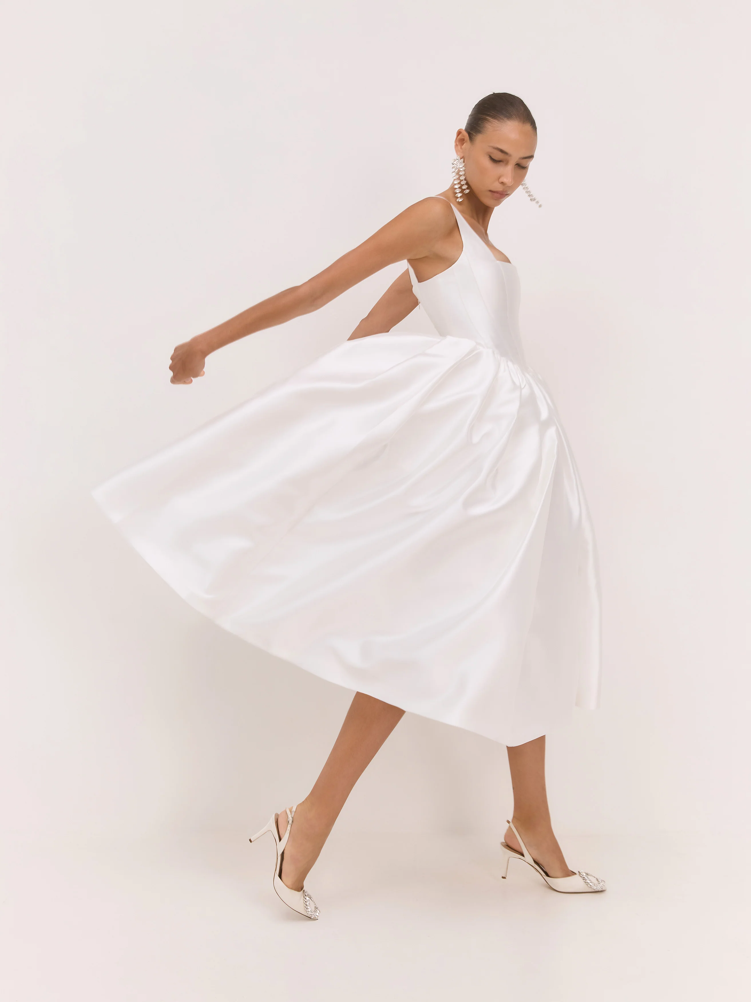 Tal is a refined take on modern minimalism, crafted from white satin drill with a corset bodice and square neckline. The midi length adds an elevated touch, creating a sleek and timeless silhouette for the contemporary bride.